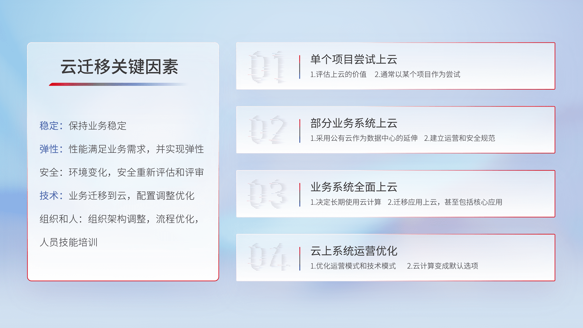 结合实际业务,,从规划设计、、云平台选型、、、、云原生改造、、、、数据迁移、、、集成交付,,,,迁移全过程为客户识别最佳上云路径,,做好风险识别管理,,,设计网络架构、、身份权限、、、安全审计合规、、操作审计、、、、日志审计、、监控告警策略、、、、多站点容灾设计等,,对云上基础设施进行整体规划,,,提升IT治理水平,,以满足弹性、、高可用、、高性能的需求。。。。