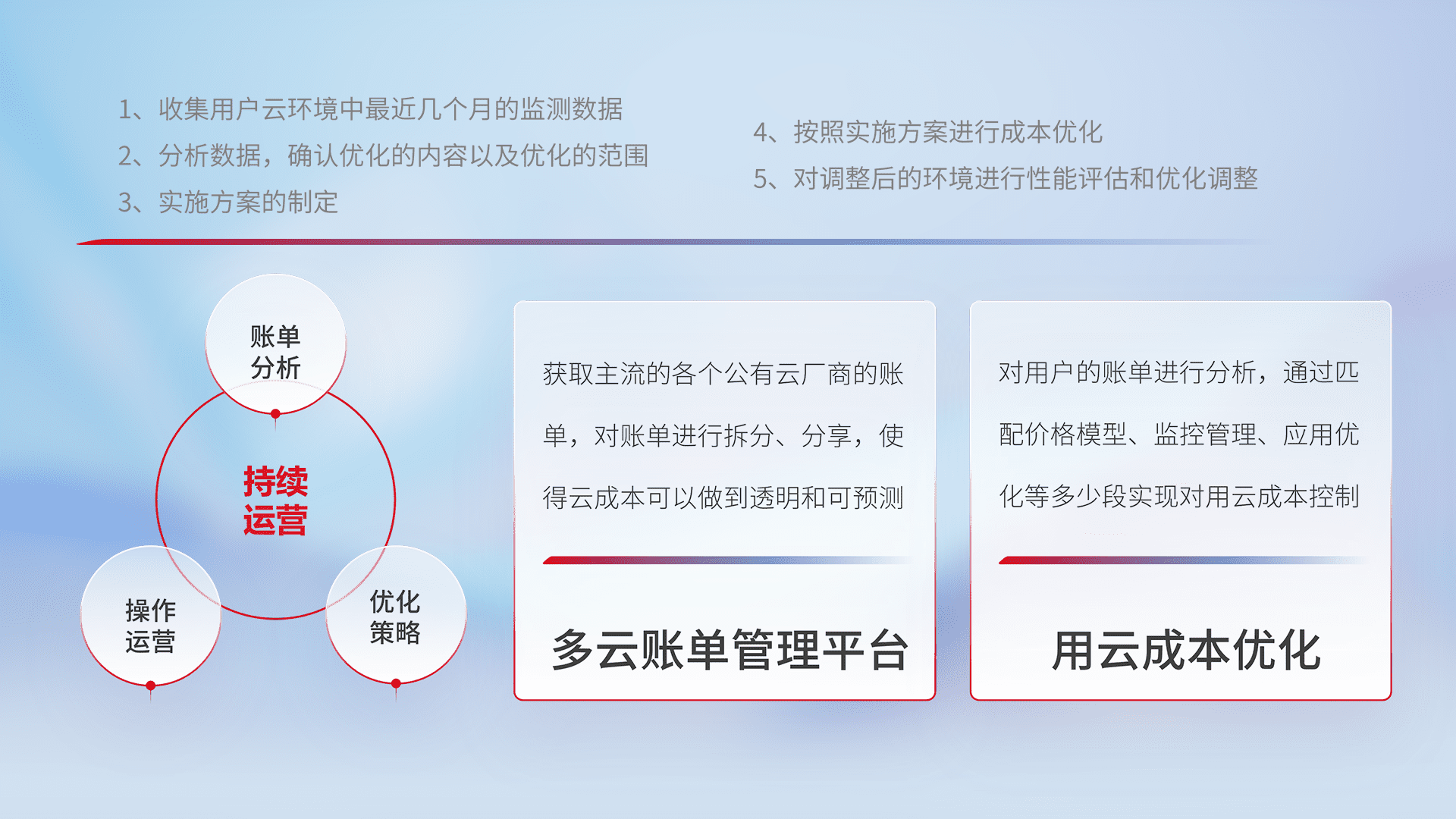 通过多云纳管,,,,以统一的资源数据模型把客户的云资源进行抽象和封装,,进而实现对多云资源的统一操作,,,保障云资源管理的可靠性、、、、稳定性与可用性。。。。量身定制化运维内容,,,,配置、、、开发运维、、、、补丁管理、、、备份、、、监控、、、、认证和访问管理、、审计和日常巡检等,,,保障在用云过程中的可靠度,,,稳定度以及高可用率。。